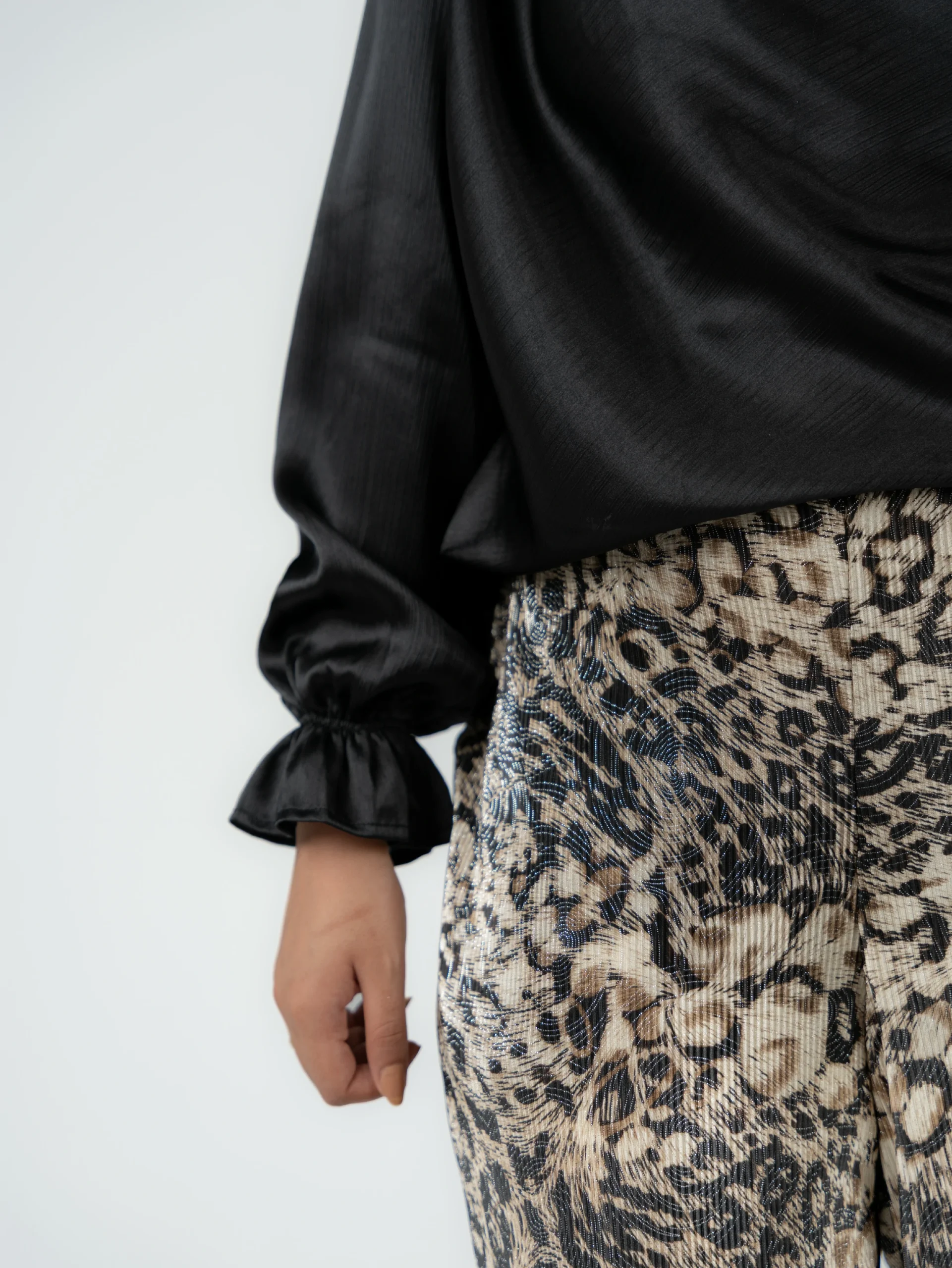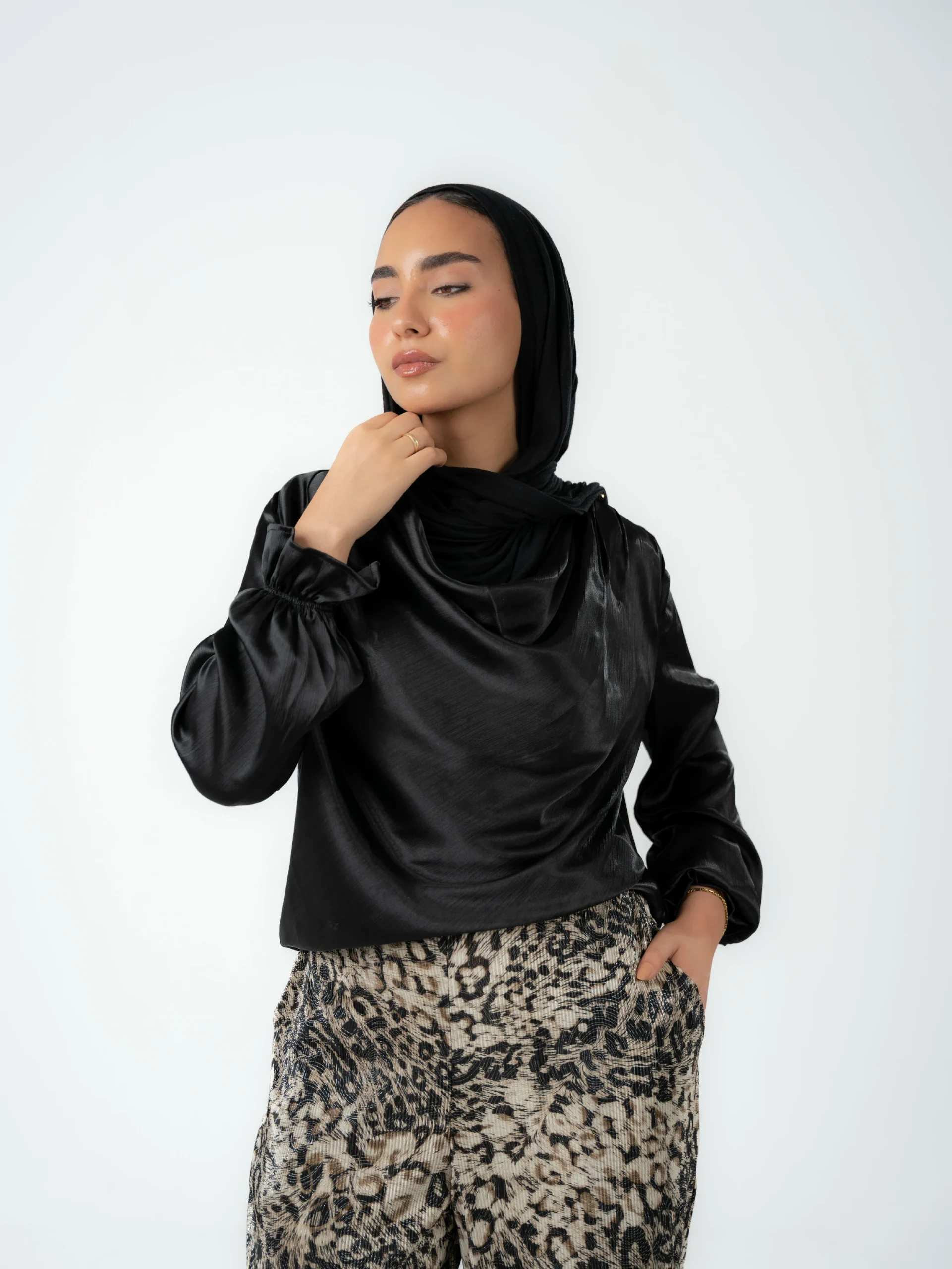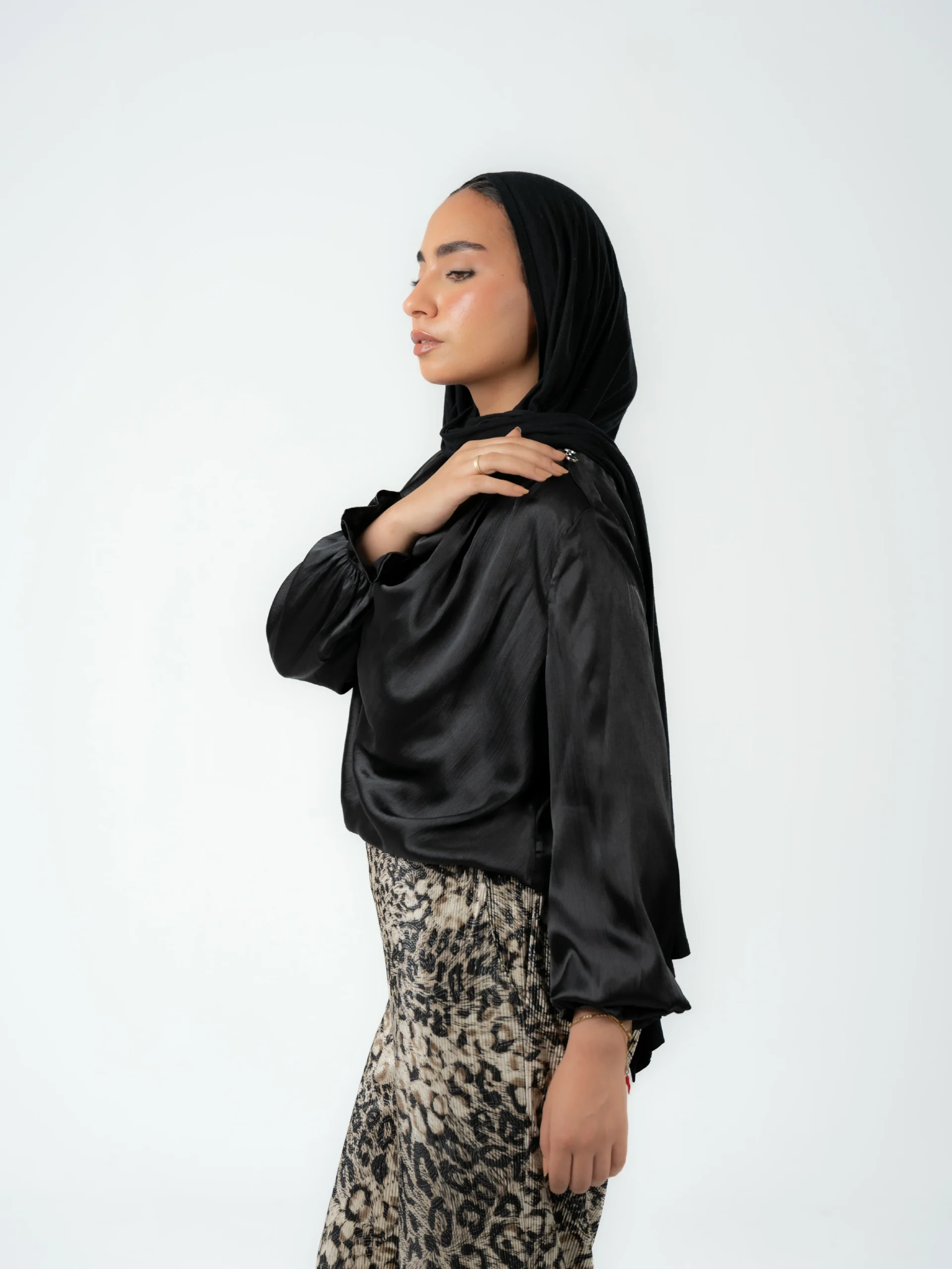 بلوزة ساتان باللون الأسود الراقي، بملمس ناعم ولمعة أنثوية تضيف لمسة فاخرة لإطلالتك. تصميمها الأنيق وخامتها الانسيابية يجعلها مثالية للمناسبات الخاصة أو لإطلالة مسائية مميزة.