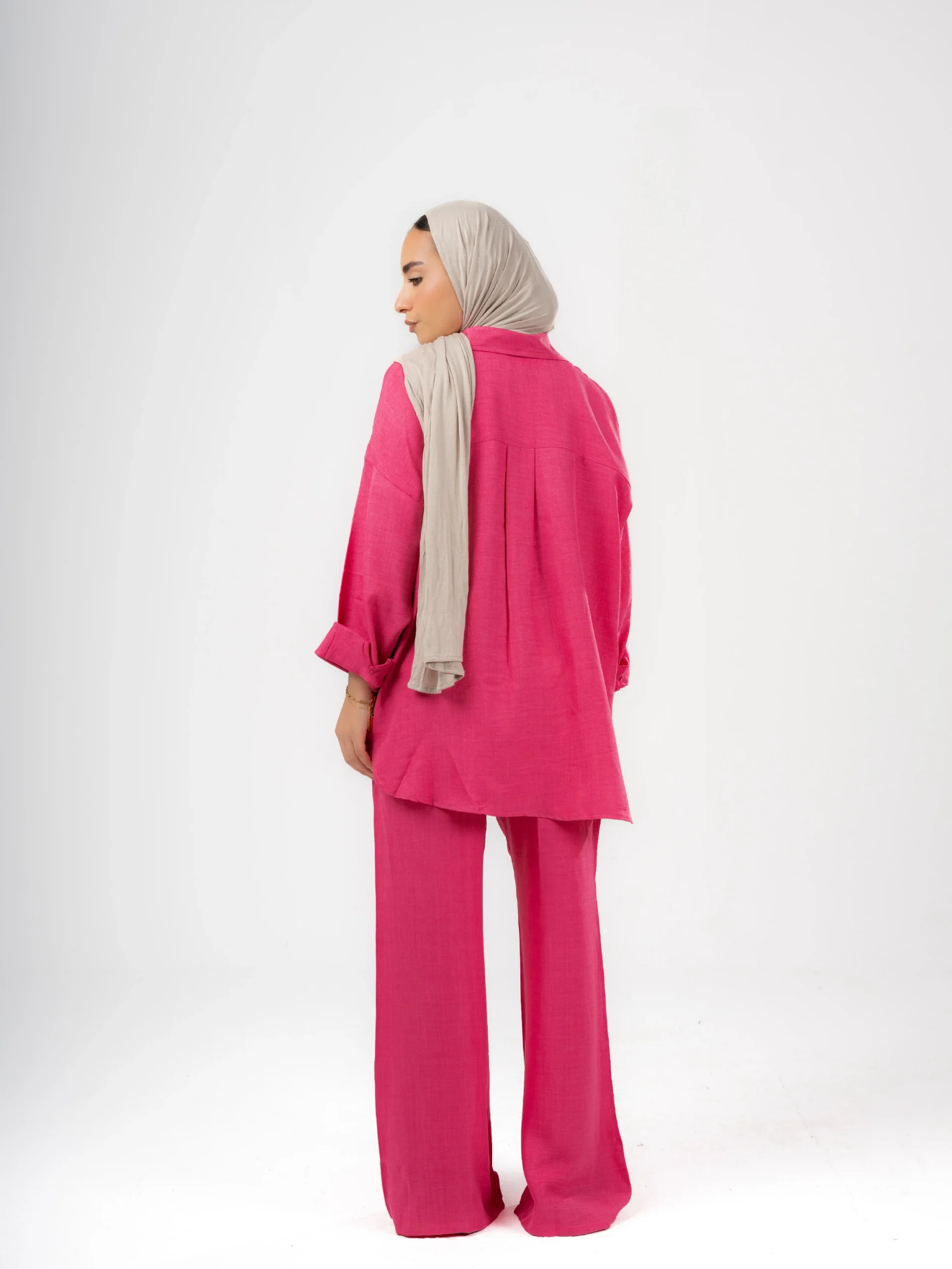 طقم من الكتان باللون الوردي الناعم، يجمع بين الراحة والأناقة بأسلوب عصري. مصنوع من خامة كتان طبيعية وخفيفة تسمح بتهوية مثالية في الأجواء الحارة، مع تصميم انسيابي يمنحك إطلالة أنثوية منعشة تناسب الإطلالات الصباحية والمناسبات الكاجوال